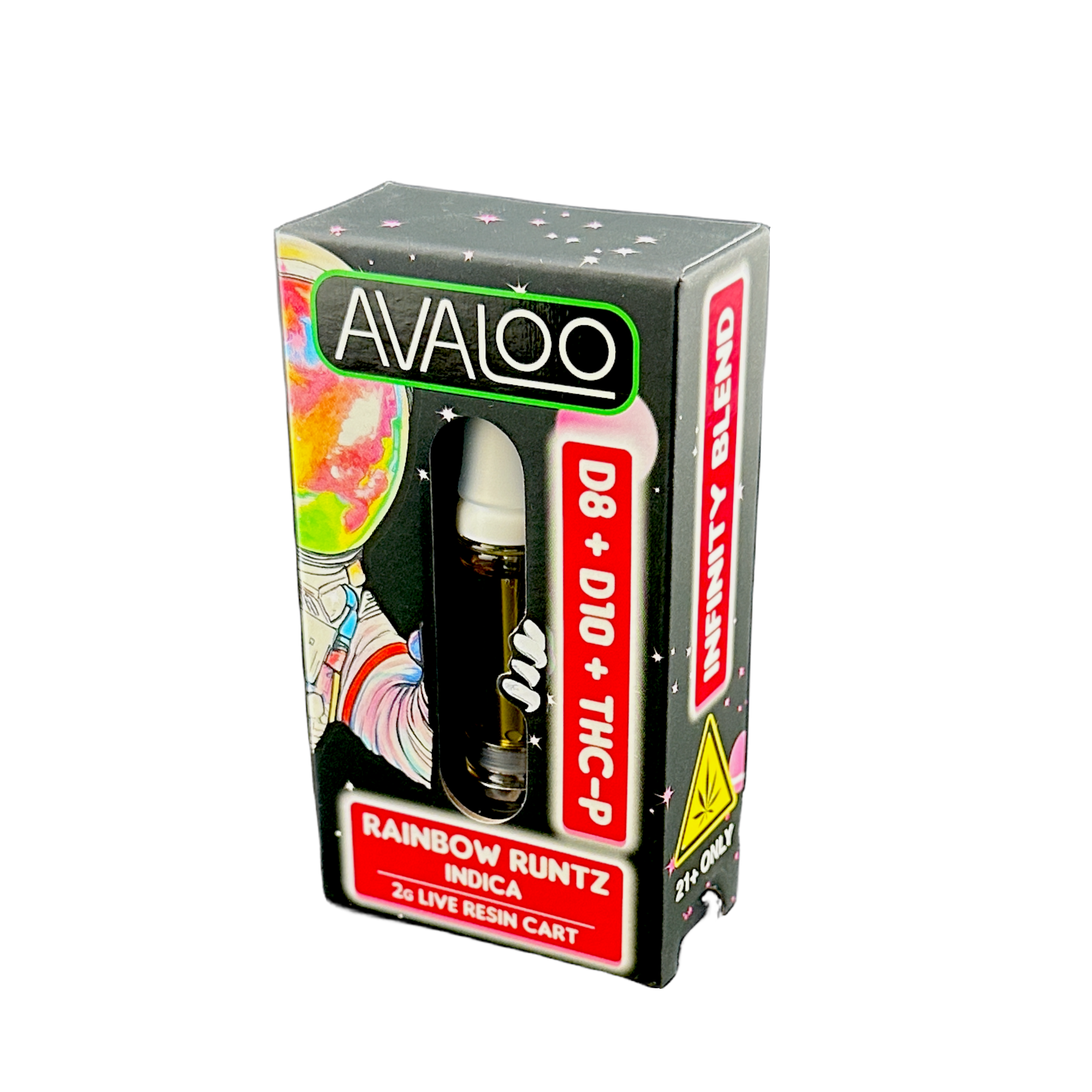 Avaloo’s signature Delta 8 Infinity Blend combines premium Delta-8 live resin with our house blend of Delta-10 and THC-P in a 2g vape cart for an incredible high that’s perfect for on-Experience a vibrant and relaxing high with the Delta 8 Infinity Cartridge 2g – Rainbow Runtz Indica. This premium cartridge is crafted with a powerful blend of Delta 8, Delta 10, and THC-P, offering a well-rounded, smooth vaping experience. Rainbow Runtz Indica is a flavorful, indica-dominant strain that combines the best qualities of its parent strains, Runtz and a mystery indica. The result is a delightful, sweet, candy-like flavor profile with hints of tropical fruit, citrus, and earthy undertones. Rainbow Runtz offers a calming, relaxing body high, making it the perfect strain for unwinding after a long day or settling in for a night of relaxation. The strain provides a euphoric head high that pairs well with the deep, physical relaxation that follows, leaving users in a state of comfort and tranquility. This makes it perfect for evening use, stress relief, or anyone in need of a soothing experience that won’t weigh them down too heavily.